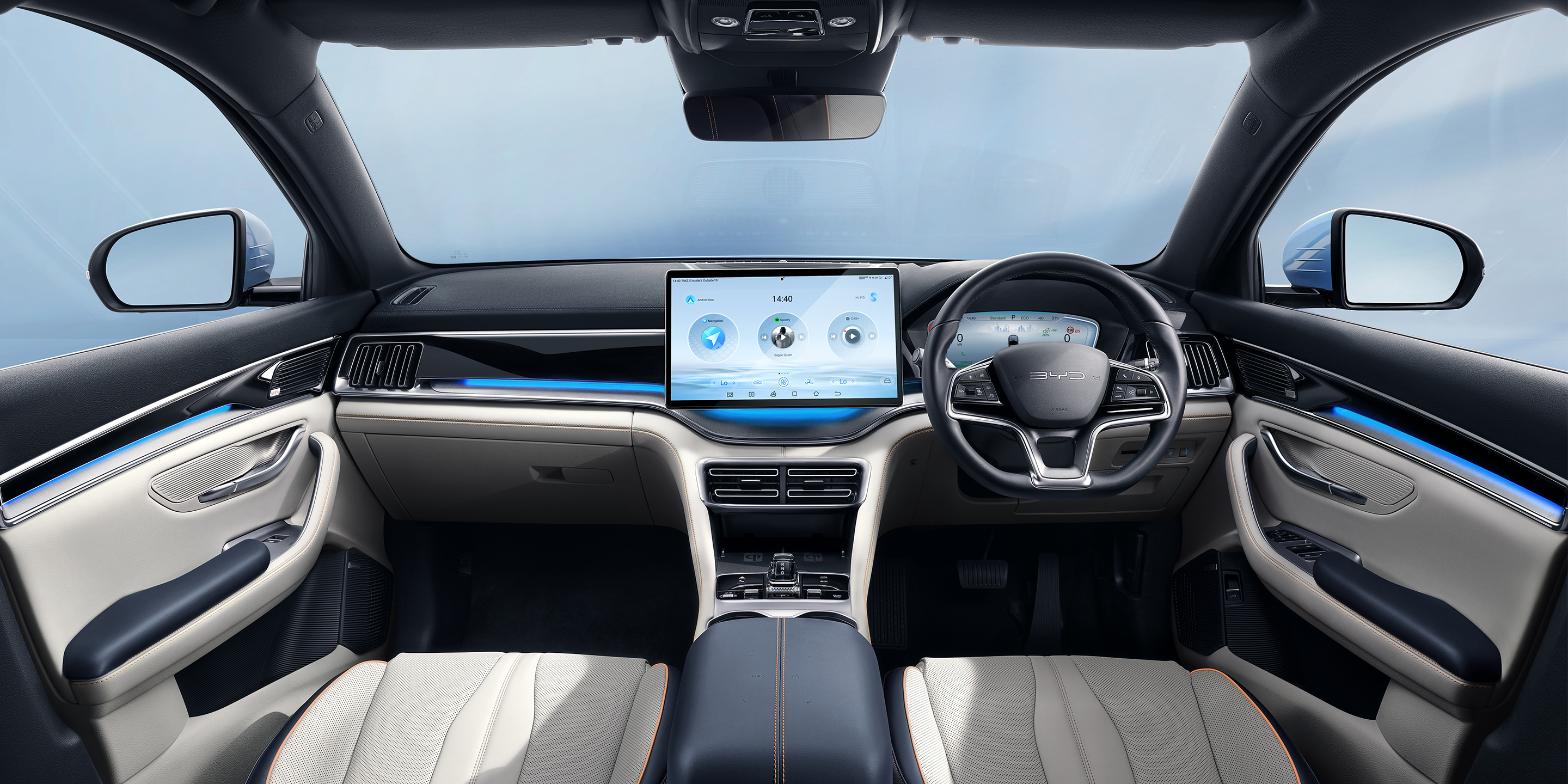 Ở nội thất, giống như các phiên bản chạy điện của BYD đã bán ở Việt Nam, hãng trang bị màn hình giải trí kích thước lớn (12,8-15,6 inch) dạng xoay giữa táp-lô. Đây là nơi tùy chỉnh hầu hết các chức năng của xe. Màn hình tốc độ dạng kỹ thuật số.